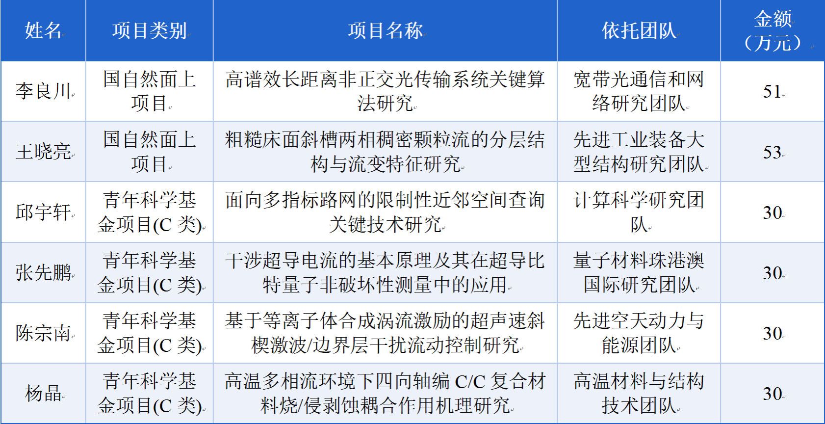 近日,国家自然科学基金委员会公布了2025年国家自然科学基金面上、青年科学基金等项目的资助清单,空天信息学域共获批立项6项,含面上项目2项,青年科学基金项目(C类)4项,获批经费224万元,覆盖计算科学、航空航天工程、光通信工程、材料工程、颗粒流体力学、量子物理等前沿领域。