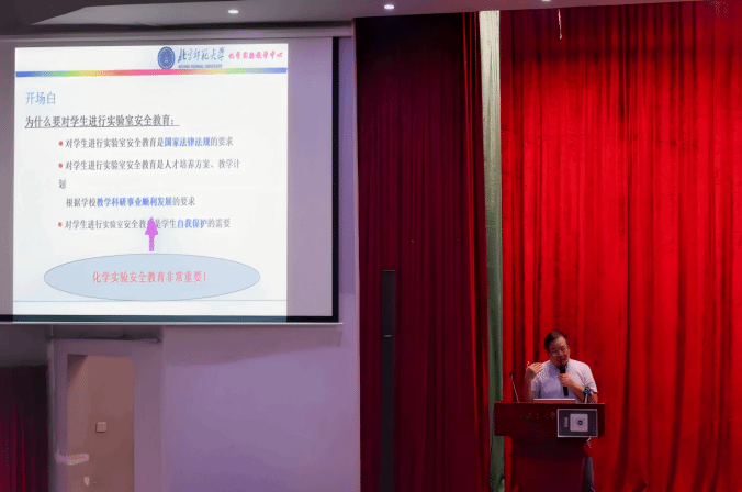 本次大会特邀北京师范大学文理学院化学系蒋福宾教授为新生开展实验室安全准入教育培训,围绕安全意识培养、危险源识别、不安全行为防范及应急处理等核心内容展开讲解。蒋教授结合真实案例深入剖析事故成因,强调严格遵守实验室操作与保密规范的重要性,提醒同学们防患于未然。